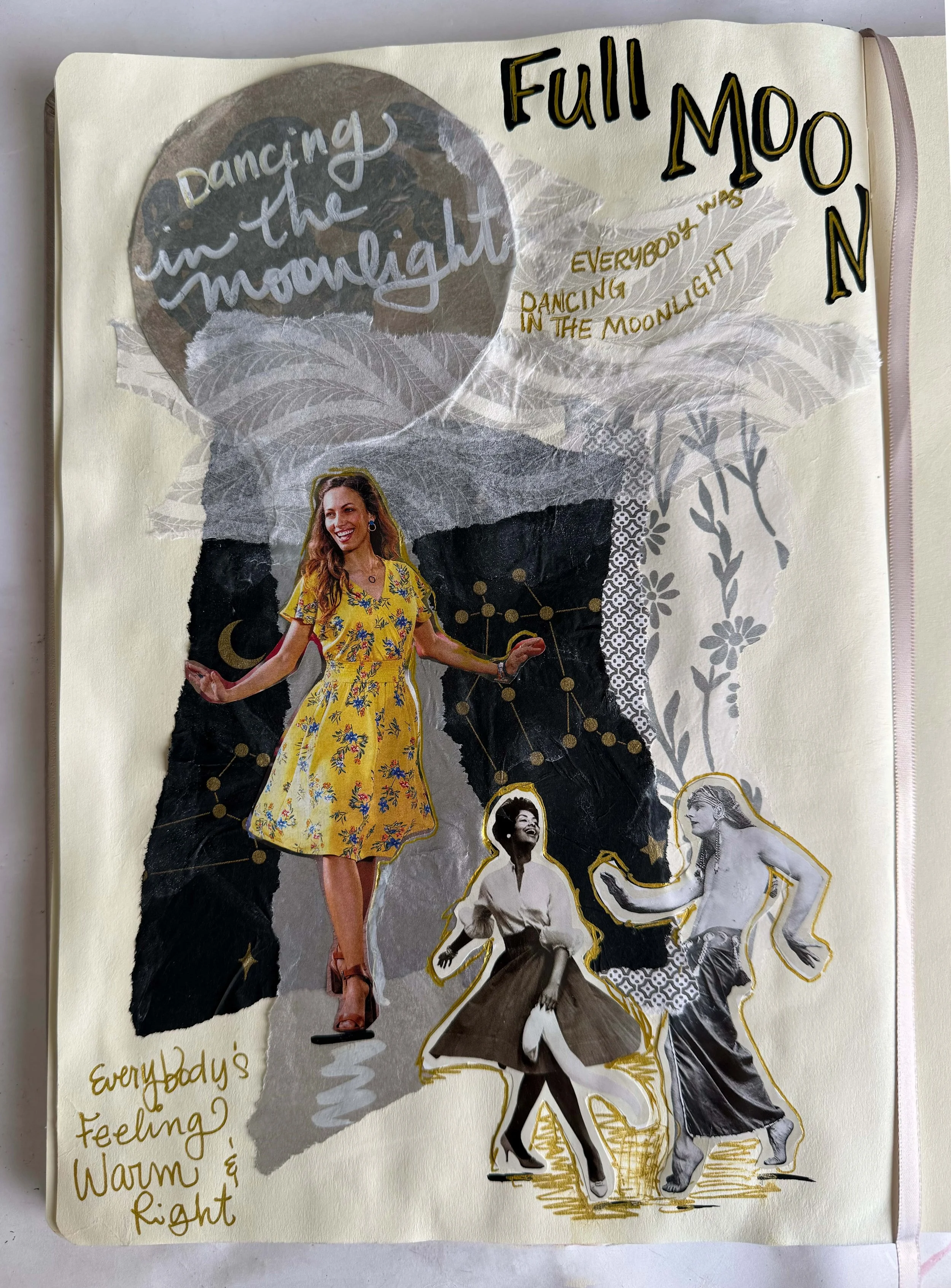 ∙Scraps of foil, tissue paper, vellum, or any light-catching bits ∙Magazine clippings, old Polaroids, retro stickers ∙Lyrics from your favorite moon songs (hello, King Harvest!) ∙A blank page in your journal, or a piece of cardboard, if you’re feeling wild